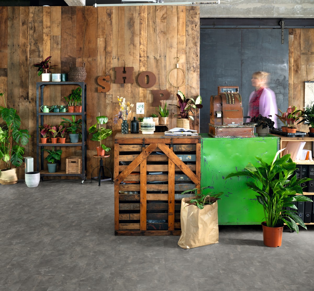 Kombinuje tmavosivú farbu na stenách so surovými materiálmi, ako je kov a drevo, čím vytvára štýlovú atmosféru. Hodia sa tu podlahy v sivých, ale aj prírodných odtieňoch.