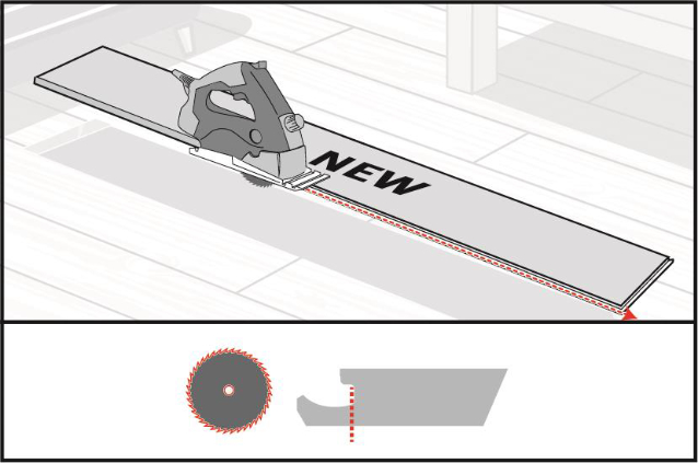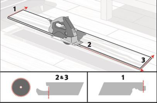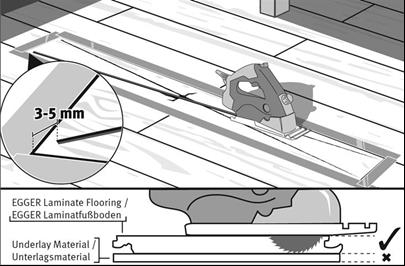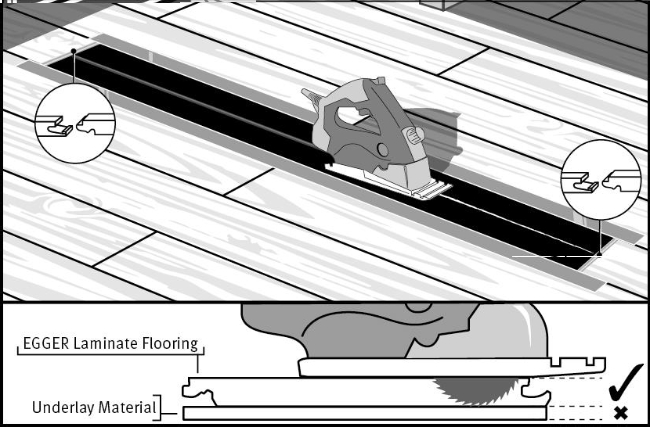 Pred začiatkom rezania si najprv upravte presnú hĺbku rezu ponornej / kotúčovej píly (viď. obrázok: hĺbka rezu = hrúbke podlahovej dosky+ výška vodiacej lišty), aby nedošlo k poškodeniu podkladových materiálov. Pokiaľ dôjde k poškodeniu izolačnej podložky, prelepte ju parotesnou lepiacou páskou. K píle pripojte vysávač. Aby ste ochránili hrany, môžete tiež vyvŕtať malé otvory vo všetkých 4 rohoch.