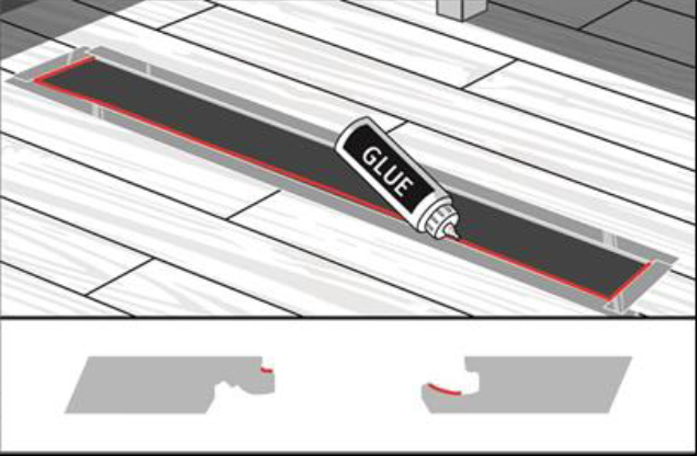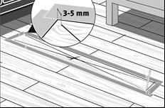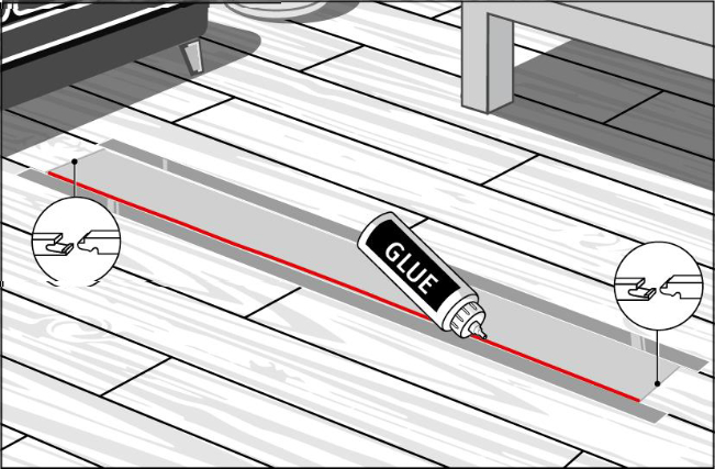Nakoľko sú spoje náhradnej dosky upravené, ako je popísané vyššie (drážka v priečnom a pozdĺžnom smere a pero v priečnom smere), musí sa doska v mieste upravených spojov prilepiť. K tomuto účelu je potrebné použiť lepidlo na drevo D3 (PVAC). Biele lepidlo naneste v primeranom množstve na hornú časť pera a do drážok susediacich podlahových dosiek (viď. obrázok).