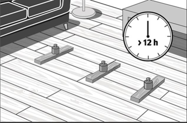 Novo vloženú náhradnú dosku je potrebné následne zaťažiť po dobu najmenej 12 hodín ( napr. knihami, bedňami na náradie a pod.), aby mohlo lepidlo vytvrdnúť. Počas tejto doby sa nedoporučuje opravenú oblasť zaťažovať, ani po nej chodiť.