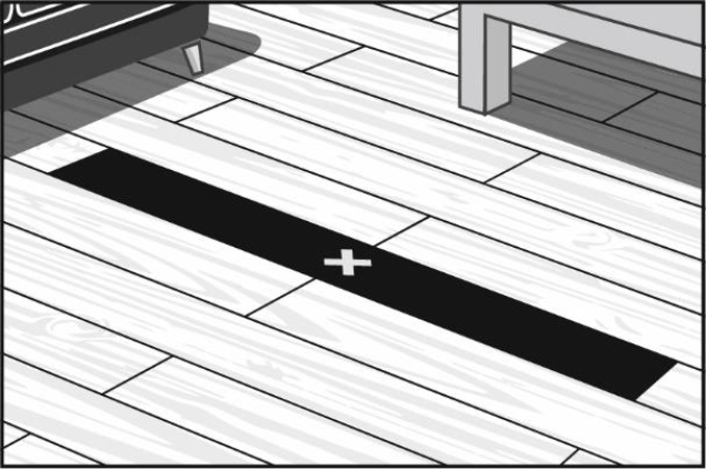Na poškodenej podlahovej doske si vyznačte plánovaný priebeh rezu, ktorý bude končiť v rohoch vo vzdialenosti 3- 5 mm od okraja podlahovej dosky (viď. obrázok vpravo). Aby ste ochránili hrany a vizuálne vymedzili rozmery podlahovej dosky, prelepte páskou v oblasti hrán susedné podlahové dosky ( viď. obrázok vľavo).