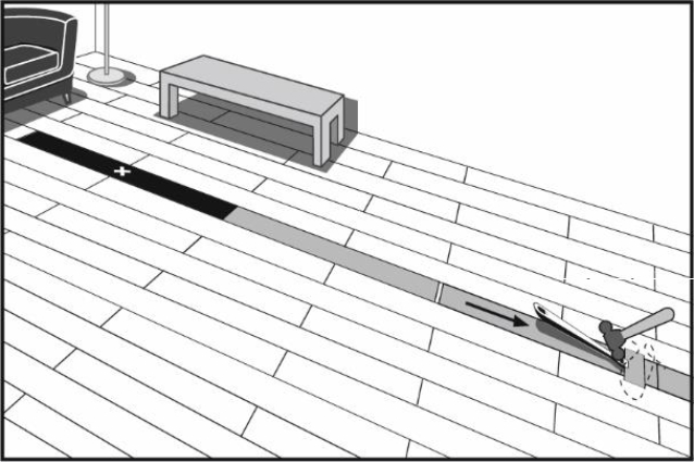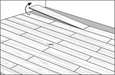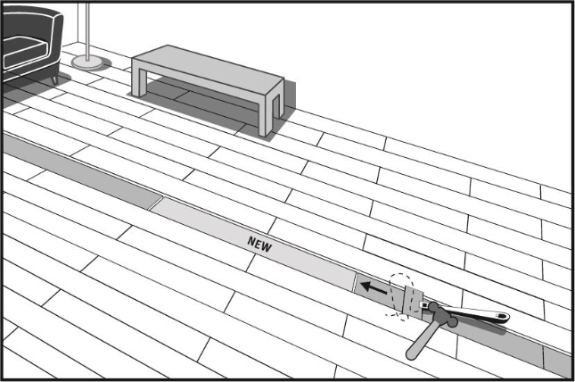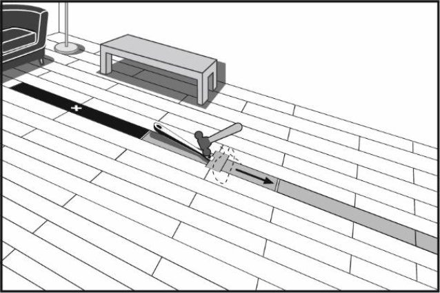 Umiestnite nástroj pre opravu na prvú dosku v rade, v ktorej sa nachádza poškodená podlahová doska a poklepte na túto dosku smerom ku stene, pokiaľ nie je úplne odomknutý/ otvorený krátky bočný spoj (viď. obrázok). Odstráňte z tejto dosky nástroj pre opravu, umiestnite ho na druhú dosku v rade a znova poklepaním odomknite krátky bočný spoj vodorovne smerom od seba. Tento postup opakujte, pokiaľ sa nedostanete k poškodenej podlahovej doske a neuvoľníte jej prednú stranu (viď. obrázok). Rovnaký postup opakujte na opačnej strane, pokiaľ nebude odomknutý krátky bočný spoj poškodenej podlahovej dosky.
