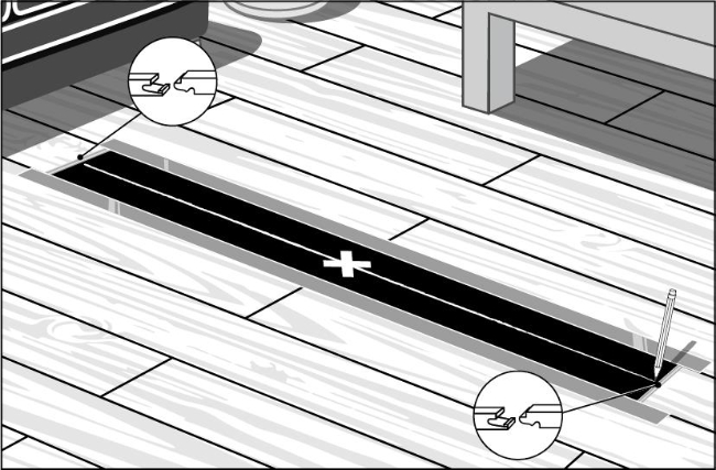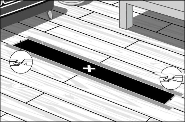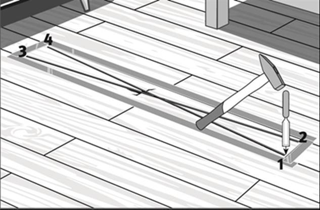 Poškodenú dosku určenú k výmene rozrežte na 4 časti pomocou 2 diagonálnych rezov pozdĺž nakreslenej línie rezu (viď. obrázok), rez zakončite vo vzdialenosti 3 až 5 mm pred hranou/ okrajom podlahovej dosky.