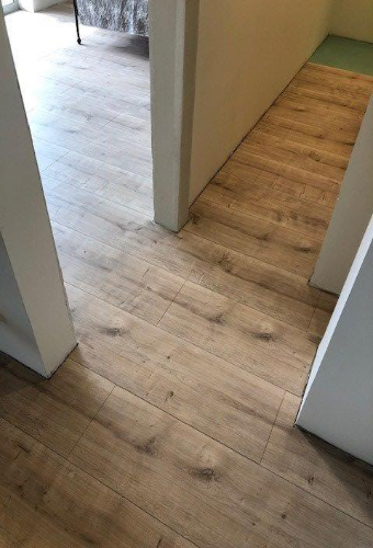 Nesprávna plávajúca pokládka laminátovej podlahy bez vytvorenia dilatačných medzier na prechodoch medzi chodbou a izbami