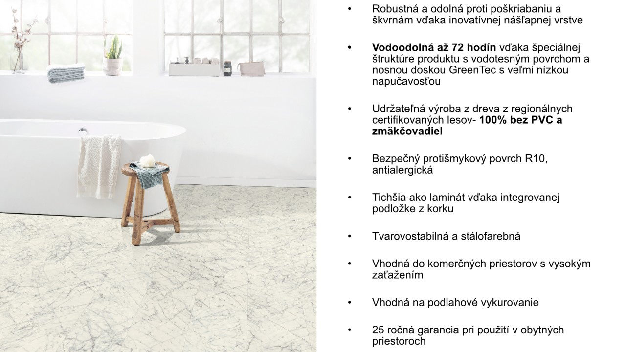 Vďaka špeciálnej štruktúre produktu a vodoodolnému povrchu, nosnej doske GreenTec s veľmi nízkou napúčavosťou a flexibilnému montážnemu systému Clic it! dokáže odolávať vode až 72 hodín. Preto je kompozitná podlaha GreenTec výborným riešením do kúpeľne, kuchyne a tiež do obytných, komerčných priestorov a vstupných hál s vysokou frekvenciou pohybu.