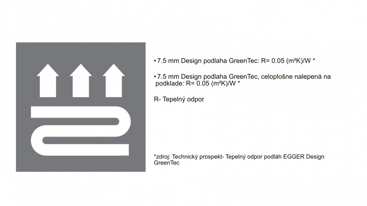 Kompozitná podlaha Design GreenTec vďaka optimálnej hrúbke 7,5 mm a vysokej hustote nosnej dosky GreenTec má nízky tepelný odpor (R), len 0.05 m2*K/W a preto je vhodná na elektrické ako aj teplovodné podlahové vykurovanie.