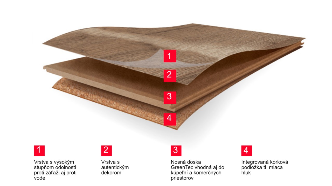 Vďaka špeciálnej štruktúre má podlaha DESIGN GreenTec skutočne všestranné použitie. Jej extrémne stabilné jadro a pevný povrch podlahu chráni, zatiaľčo integrovaná podložka z korku spoľahlivo pohlcuje kročajový hluk. Je známe, že drevo si udržiava výborné fyzikálne a mechanické vlastnosti aj pri zvýšenej teplote. Testy výrobcu dokázali, že nosná doska GreenTec, ktorá je vyrobená na báze dreva je tvarovo stabilná aj pri zvýšenej teplote a preto sa podlaha DESIGN GreenTec nedeformuje ak sa jej povrch rozpáli napr. za veľkými francúzskymi oknami. Tieto vlastnosti určite oceníte, ak kladiete podlahu v miestnostiach s veľkými presklennými plochami, oknami, kde hrozí, že povrch podlahy sa môže počas slnečných dní rozpáliť na vyššiu teplotu, čo pri podlahách vyrobených z PVC môže viesť k deformácií.