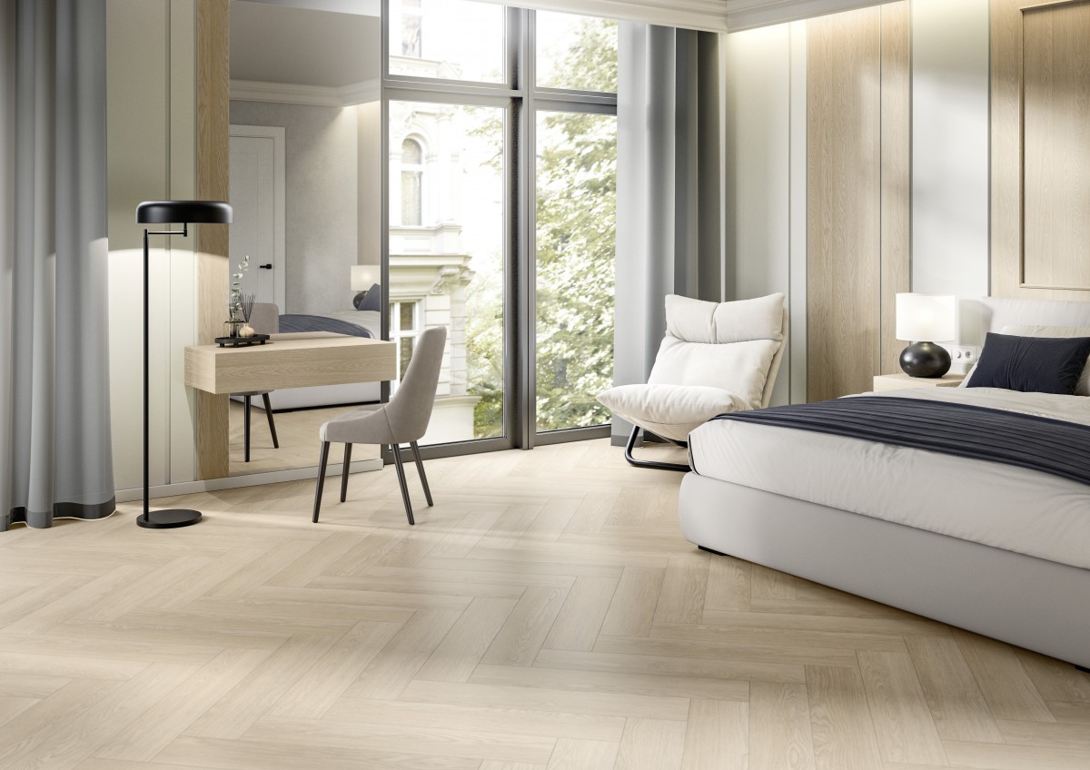 Zvlášť vyniká podlaha s klasickým vzhľadom parkiet v dizajne rybej kosti. Matná synchronizovaná štruktúra dekoru Dub Baronia opticky približuje podlahu prírodnému drevu, ale zároveň ponúka všetky funkčné výhody podláh EGGER a je súčasťou ponuky Interior Match.