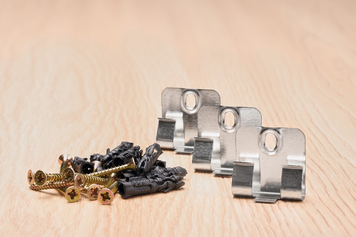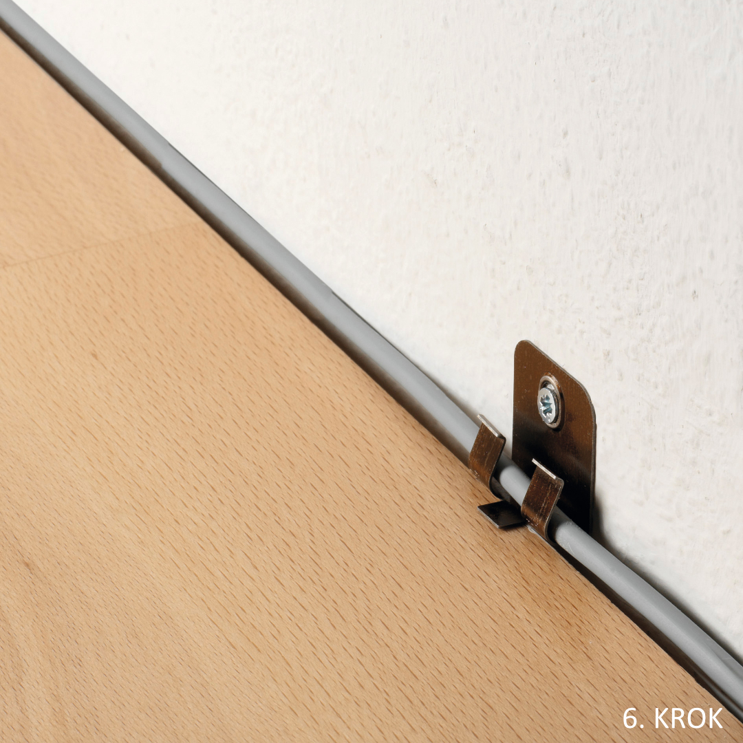 Kovové úchyty sú vhodné pre základný profil líšt EGGER (60 mm). V drážke klipu je možné viesť 1 kábel, ktorý bude za lištou neviditeľný. Výhodou tohto spôsobu montáže je možnosť lišty v prípade potreby zosadiť (napr. pri maľovaní) a opätovne nasadiť.